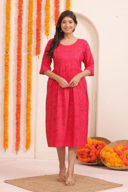 Comfortable and stylish maternity kurti made from soft rayon fabric. Perfect for pregnancy and nursing, with easy feeding access and breathable design for all-day wear.
